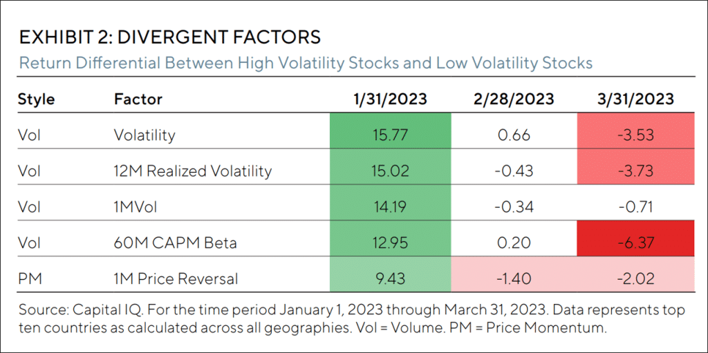 If we drill down further, we can see that most of the underperformance came during January and from a factor perspective, was driven predominately by high volatility, as shown in Exhibit 2. On a factor basis, Exhibit 2 is simply highlighting the return differential between the quintile of stocks with the highest exposure to volatility minus the quintile of stocks with the lowest exposure to volatility. From the exhibit, we can see that the January skew was quite wide and while the other two months of 2023 saw some give back, it was not nearly enough to offset how dramatic the move was in January.