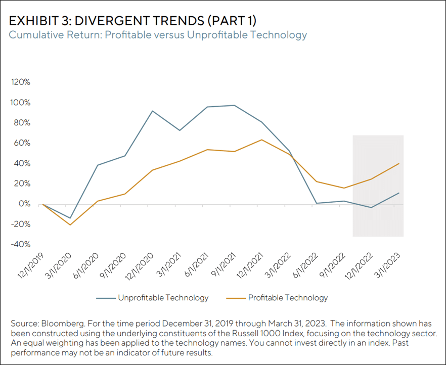 We think this is rather important to point out, because if we go back to most of the 2020-2022 time period, both the profitable and unprofitable groups traded in tandem, but to different degrees. Obviously, we can see that the unprofitable group went up more and fell more than the more profitable one, but as we approached the end of 2022, the profitable group started breaking away and this divergence accelerated throughout 1Q of 2023. For us, this is an encouraging sign, because it highlights one of our views coming into the year that while 2022 was dominated by P, or price, that 2023 would be dominated by E, or earnings. Because we believe that earnings are like gravity, this should be a more durable driver of stock price performance over time, rather than changes in sentiment.