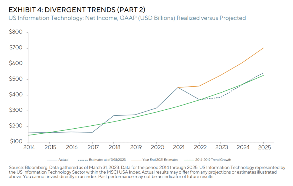 Lastly, on the “overearnings” front, which is something we have been concerned with in the technology sector and discussing for many months now, the froth appears to be taken out. When we look at Exhibit 4, we can see that unlike consensus estimates for 2022, consensus estimates for 2023 have reverted back to the pre-COVID, 2014-2019 extrapolated trend, representing a far more normalized environment in our view than what we saw in the immediate past.
