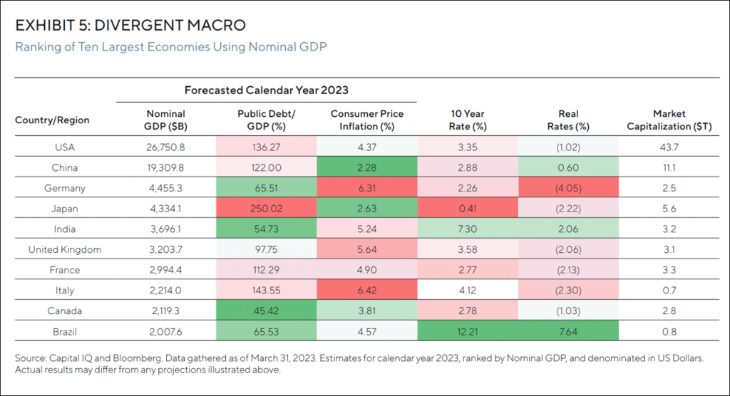 Beyond this, in Brazil, the Lula administration recently announced a framework for keeping the budget in check in fiscal year 2024 (no deficit) with expectations of a mild budget surplus in 2025.4 This is the opposite of the initial fears of what spending from a Lula regime would look like. And remember, this is from a left-leaning administration (an observable fact not political commentary). Contrast this with that of the United States, which also has a left-leaning administration, but apparently very few fears over fiscal spending, where the Congressional Budget Office is projecting a budget deficit of nearly six per cent of GDP in 2024 and beyond.5 This also coincides with strong privatization efforts in both Brazil and India, while Europe is nationalizing utilities and the US kicks around the idea of windfall profits. So much for Emerging Market countries being overly protectionist and far more profligate than Developed Market ones when it comes to fiscal spend.