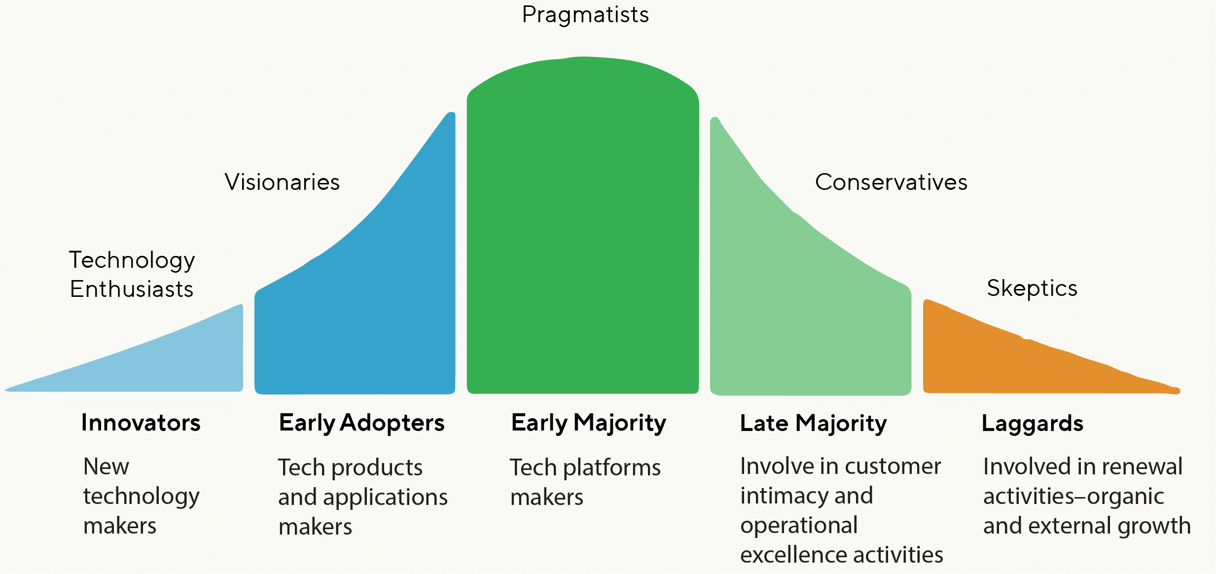 AI adoption may follow the typical trajectory of the “Innovation-Adoption Curve,” a model created in 1962 by Ohio State professor Everett Rogers as a method of explaining how, why, and the rate at which an innovation spreads through a population or social system. According to Professor Rogers, a typical adoption process goes through five stages: innovators, early adopters, early majority, late majority, and laggards.