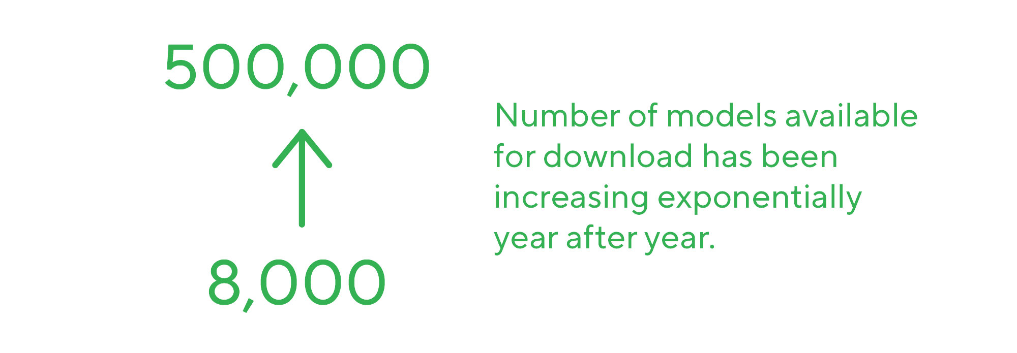 The number of AI models on Hugging Face, a platform allowing users to download datasets for model fine-tuning, has been increasing exponentially, up 352% year-over-year to nearly 500,000 as of early 2024.  Meanwhile, the mix of the AI models has also broadened rapidly.