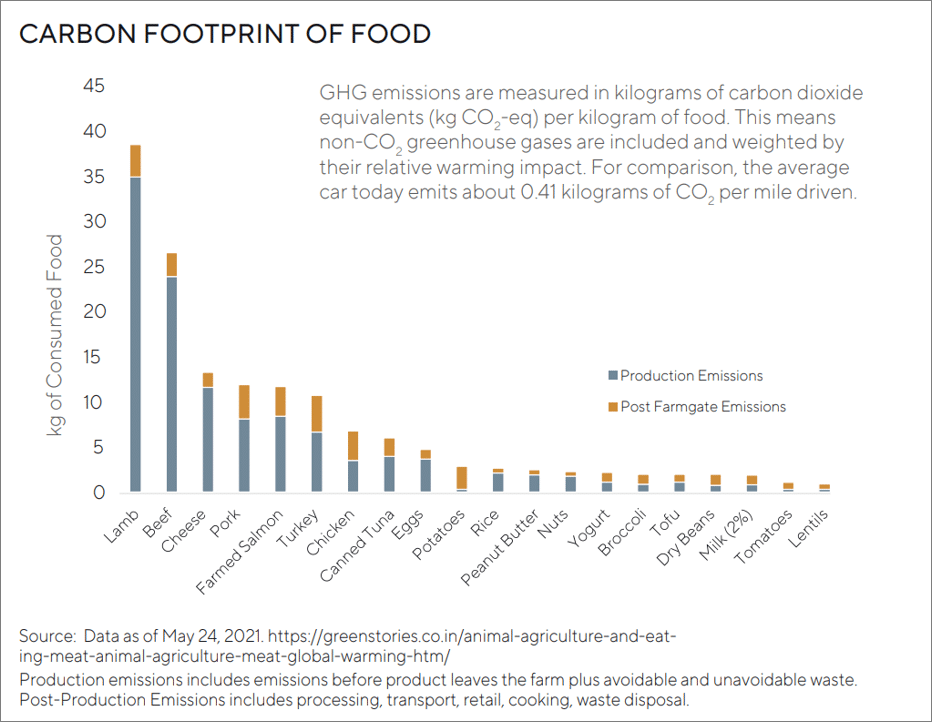 Despite these advances, we think there is little reason for the traditional meat industry to feel threatened as plant-based meats sold in patty, link, and ground form are mostly an add-on to beef and pork, and tend to serve as a substitute for chicken, fish, and turkey.12 And while there is some evidence to support potential benefits of plant- or cell-based meat, we believe the industry needs to evaluate further the impact on humans’ health and the environment.