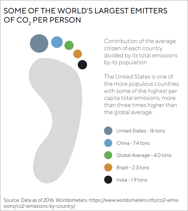 The US is one of the largest GHG emitters as the average carbon footprint for a person living in America is 16 tons per year (or more than three US homes’ electricity use for one year), one of the highest in the world. The EU, which has been one of the most vocal regions in promoting net zero still accounts for 6.8 tons of carbon emissions per person per year. Globally, the average carbon footprint is closer to four tons per person (or less than one home’s electricity use for a year)1 , and to have a chance at reaching net zero, the average global carbon footprint per person per year needs to fall below two tons by 2050.