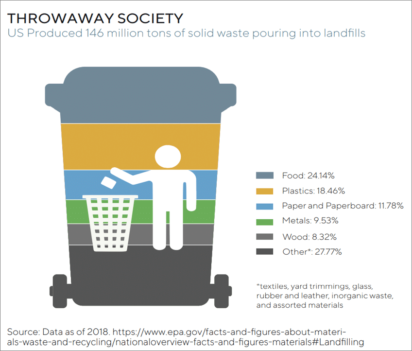 Americans make up just 4 per cent of the world’s population but account for 12 per cent of the planet’s yearly waste, or 4.9 pounds per person per day while Europeans consume in average 3.1 pounds per person per day.13 In 2018, the US produced 146 million tons of solid waste, and food accounted for more than 35 million tons or 24 per cent; plastics accounted for over 18 per cent, and paper and paperboard made up about 12 per cent. American’s garbage production is higher than any other nation in the world per capita. Same goes with clothing. About 85 per cent of our clothing and textiles are disposed of as trash and end up in landfills, while only 15 per cent are donated or recycled.14